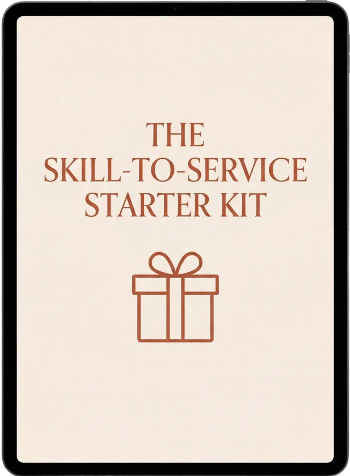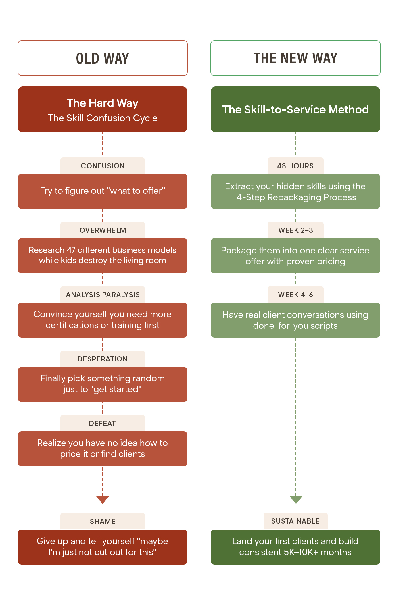 The complete Skill Repackaging Method™ including the 4-Step Skill Extraction Process, Outcome-Based Offer Formula, and 3 real mom success story walkthroughs.